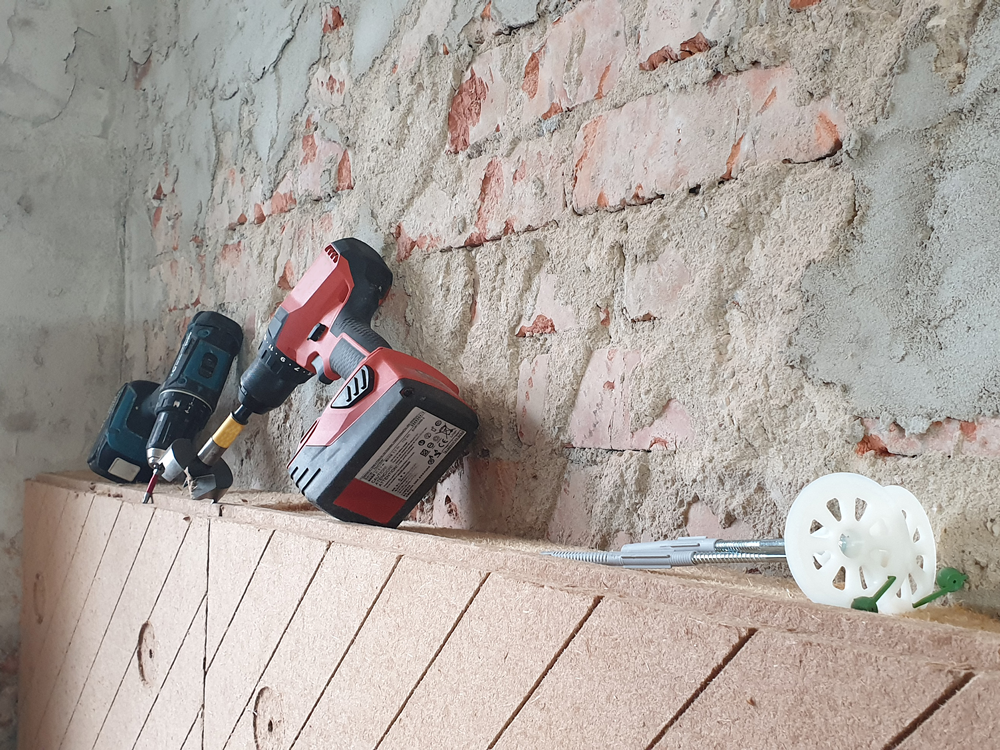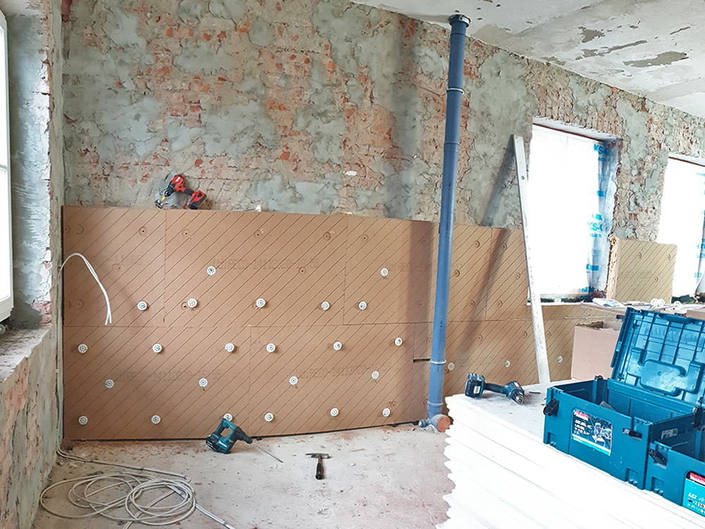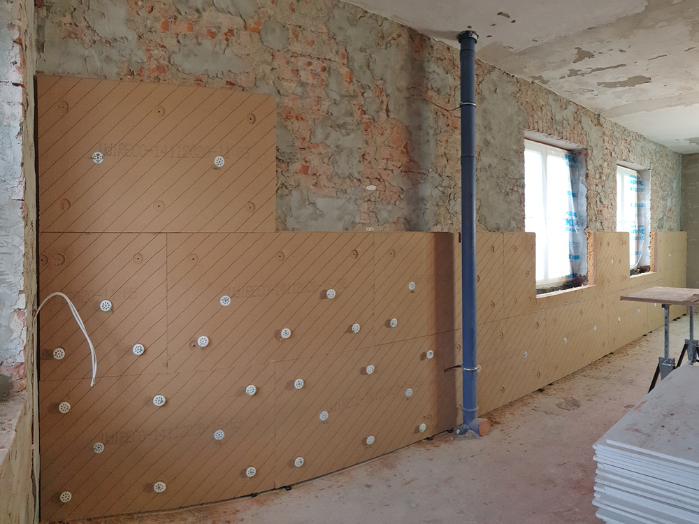 500 Quadratmeter Dämmplatten in einer Stärke von zehn Zentimetern wurden im Vellahner Ambulatorium entlang der 36,5 Zentimeter dicken Außenwände verbaut. Dazu genügte es, Tapeten und Putz im Vorfeld zu entfernen und Schäden im Mauerwerk grob zu verspachteln. Denn die Holzweichfaser-Platte UdiIN Reco ist zur Wandseite hin elastisch und kann Unebenheiten von bis zu zwei Zentimetern ausgleichen. Beim Andübeln verankern sich Widerhaken im Dämmstoff und pressen so die Holzfasern unter Aufnahme hoher Zugkräfte gegen die Wand. Das verhindert Wärmebrücken. Auf der harten, glatten Vorderseite der Platten wurde ein Kalkfeinputz aufgebracht.