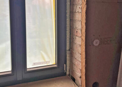 Aufgrund des jahrelangen Leerstandes und der starken Schädigung der Bausubstanz, wurde ein Gesamtkonzept aus ökologisch und bauphysikalisch verträglicher Innendämmung durchgeführt. Das Bauvorhaben bot mit fünf Wohnungen auf drei Geschossen die Chance, verschiedene Innendämm- und Heizlösungen, Schallschutzmaßnahmen und Fensterausführungen zu realisieren. Im 2. Obergeschoss wurde die Innendämmung mit 60 mm Unger-Diffutherm-Holzweichfaserplatten UdiIN® System montiert.